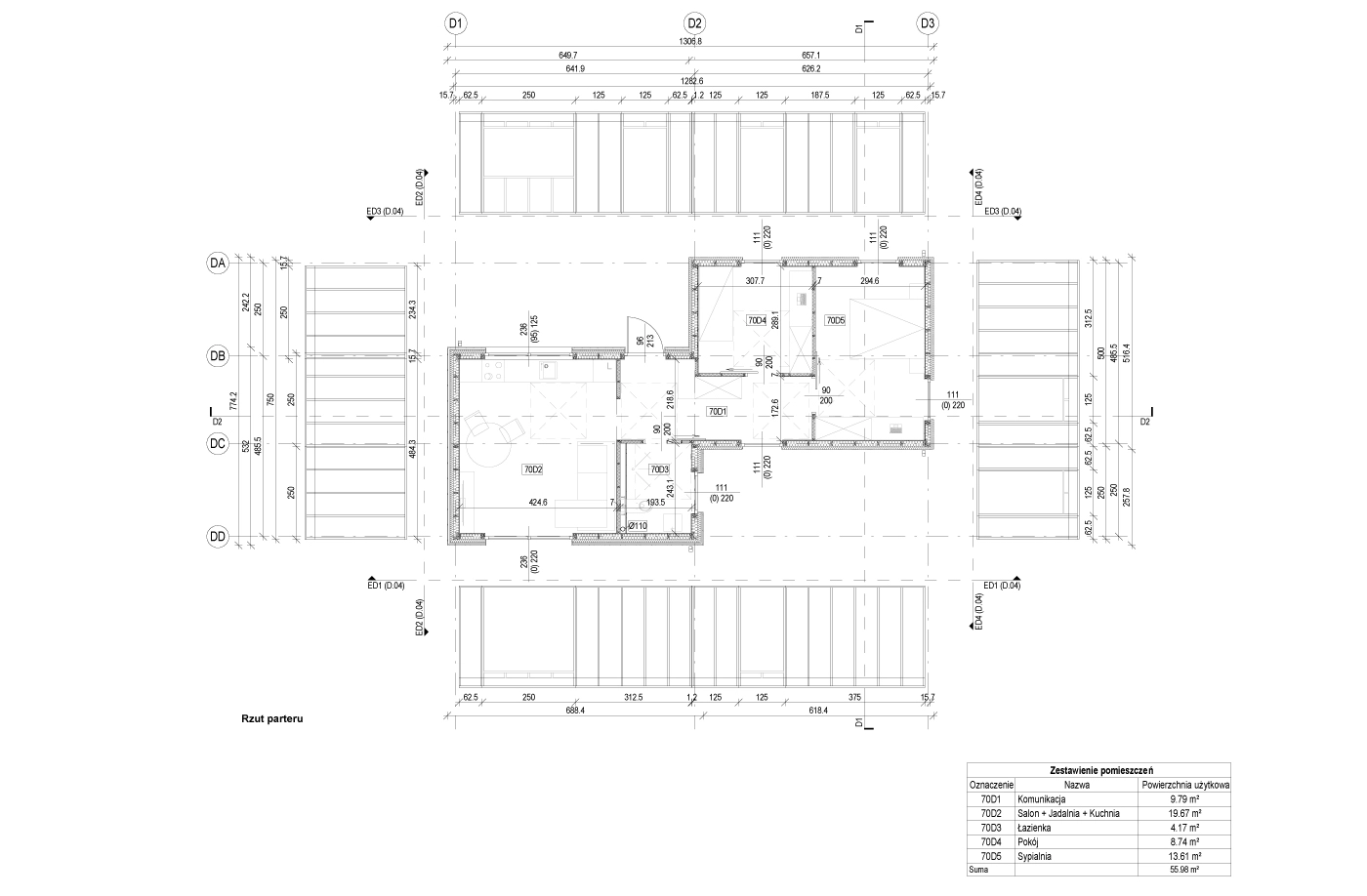 Dom modułowy typu D to propozycja dla osób poszukujących większego metrażu przy zachowaniu nowoczesnej, prefabrykowanej formy. Dzięki pełnowymiarowemu parterowi o powierzchni niemal 56 m², dom oferuje komfortową przestrzeń do życia nawet dla rodziny 2+2.
